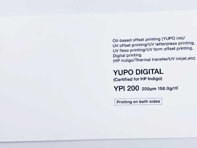 YUPO Blue ได้รับการออกแบบและรับรองสำหรับแท่นพิมพ์ HP Indigo เพื่อให้มั่นใจว่าสามารถใช้งานร่วมกันได้และให้งานพิมพ์ที่ราบรื่น มีคุณสมบัติเช่น รีไซเคิลได้ ไม่จำเป็นต้องใช้สารเคลือบก่อนพิมพ์ ทนทานต่อการฉีกขาด กันน้ำได้ 100% และมีความคงตัวของขนาด พิมพ์โดย HP indigo โปรดทราบการใช้สารเคลือบเงาให้การปกป้องเพิ่มเติมสำหรับการใช้งานที่มีความต้องการพิเศษ ก่อนการผลิตจริง โปรดดำเนินการทดสอบเพื่อให้แน่ใจว่าผลิตภัณฑ์เหมาะสมกับการใช้งาน